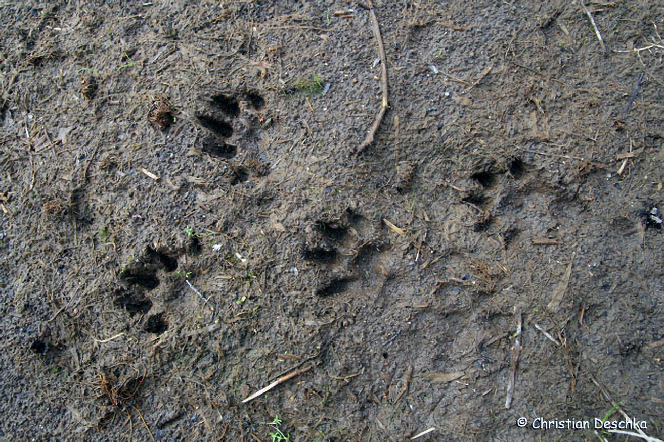 Marderhunde hinterlassen etwa fuchsgroße, aber durch stärker gespreizte Zehenballen insgesamt rundlichere Trittsiegel.