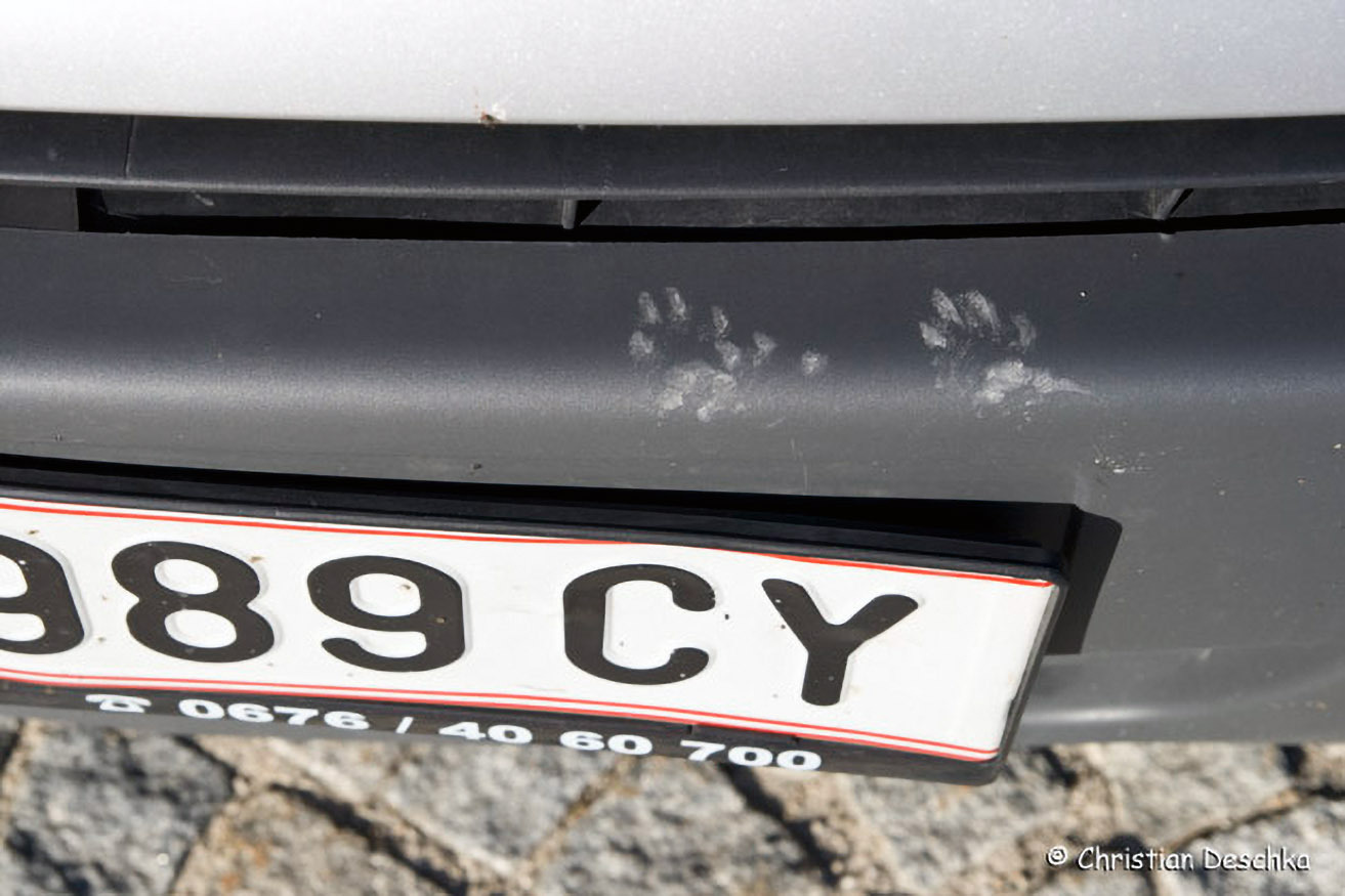 Hier sieht man Steinmarder-Fußabdrücke auf der Stoßstange eines Autos. Gelegentlich beißen die Marder Kabel durch und legen ein Auto lahm.