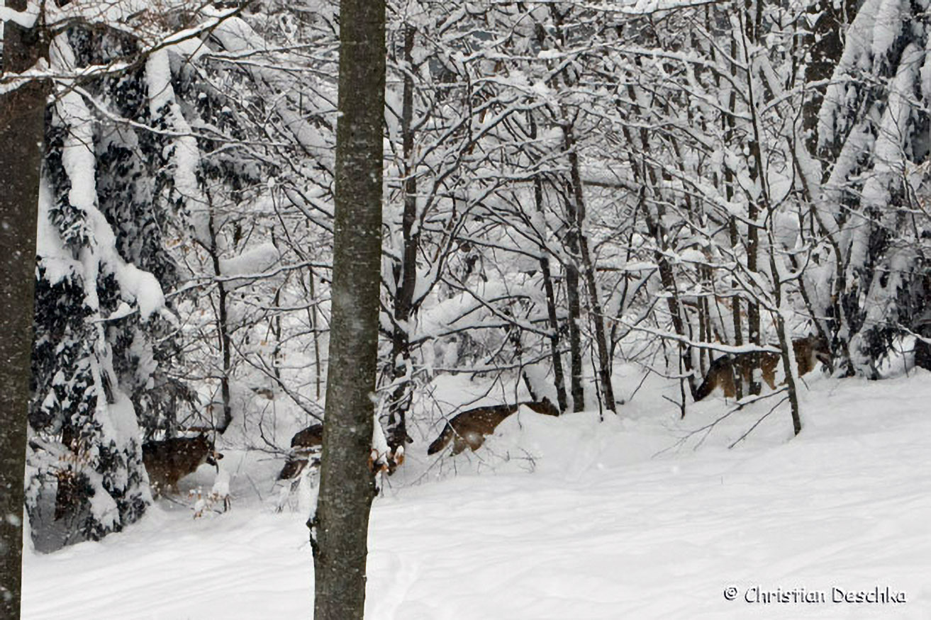 Um Energie zu sparen, steigen Wölfe in weichem Schnee exakt in die Trittsiegel der vor ihnen laufenden Artgenossen. Dadurch kann ein Wolfsrudel eine Fährte hinterlässen, die aussieht, als wäre sie von einem Einzeltier.