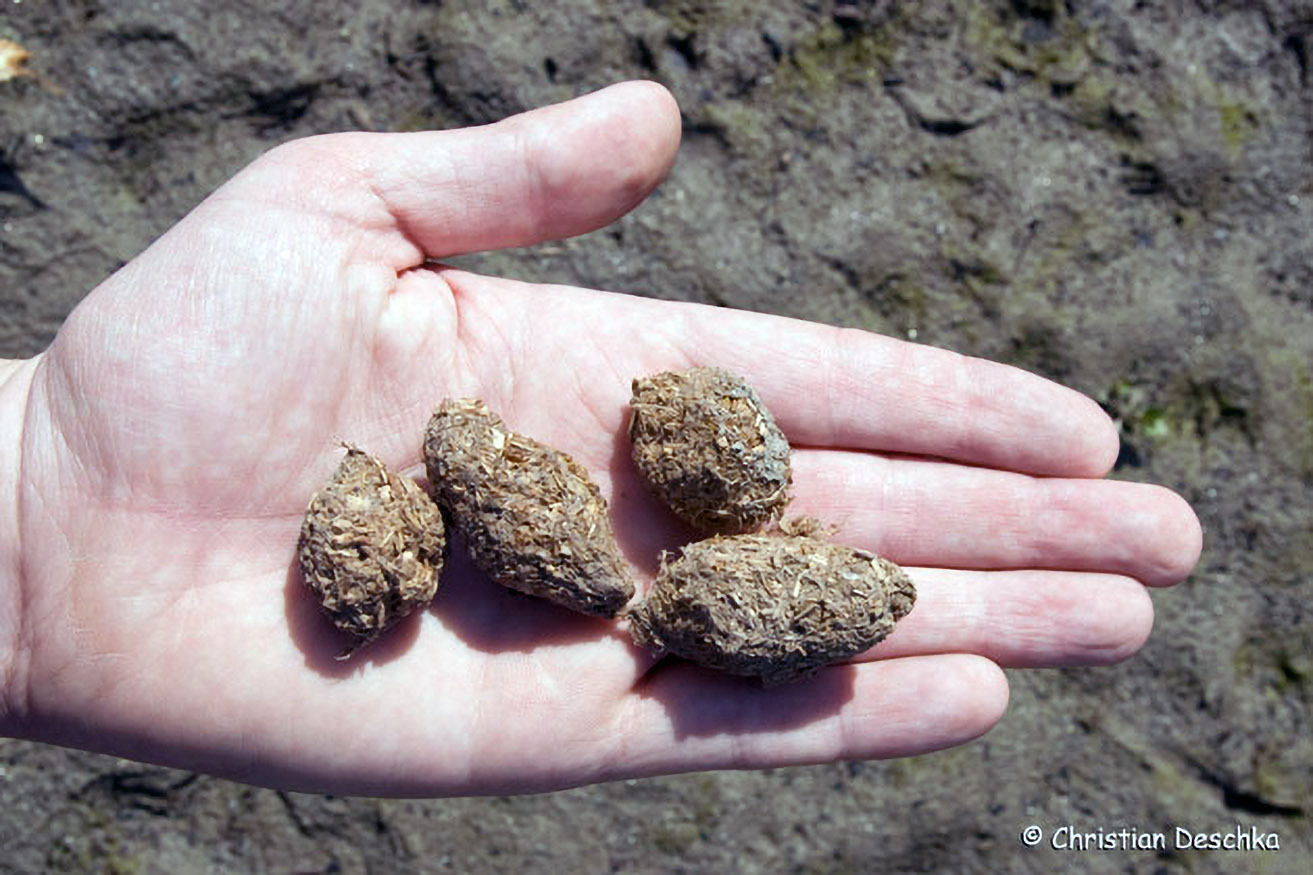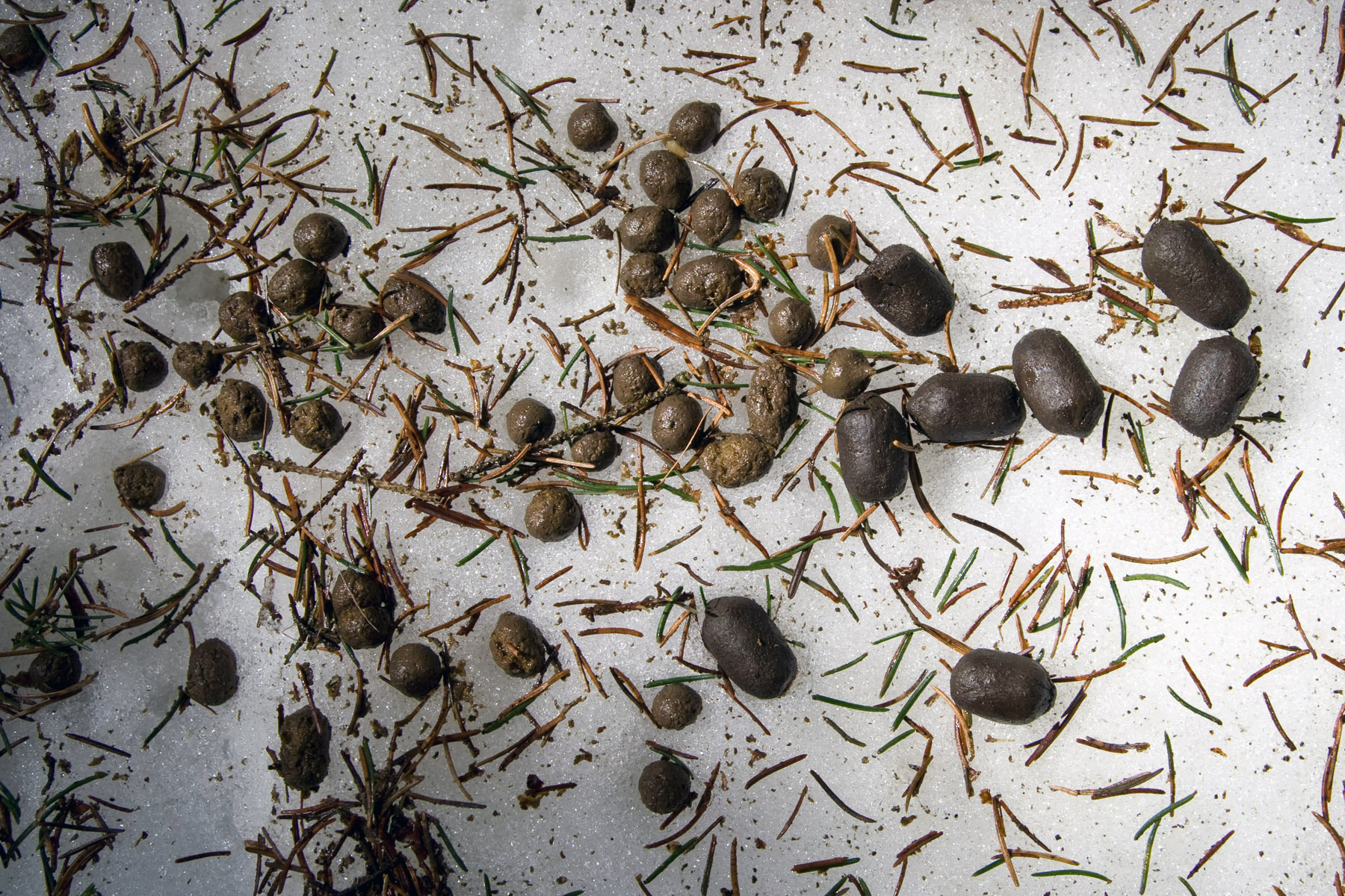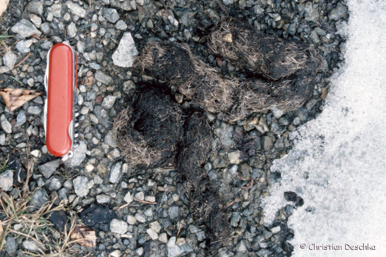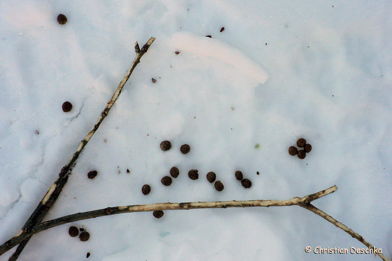 Der Kot besteht im Winterhalbjahr aus eizelnen "Bohnen", die etwa doppelt so groß sind wie jene des Rehs (links).