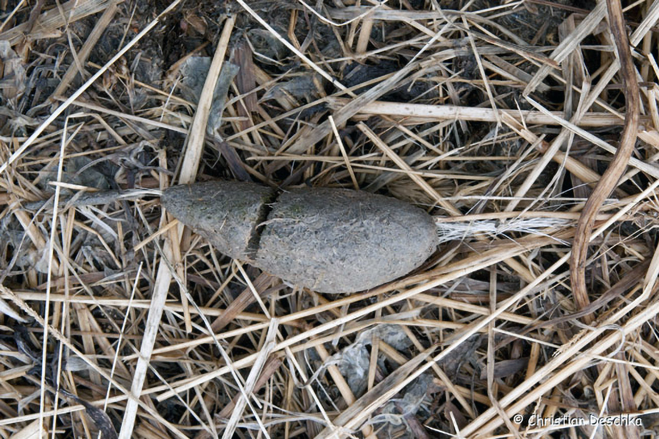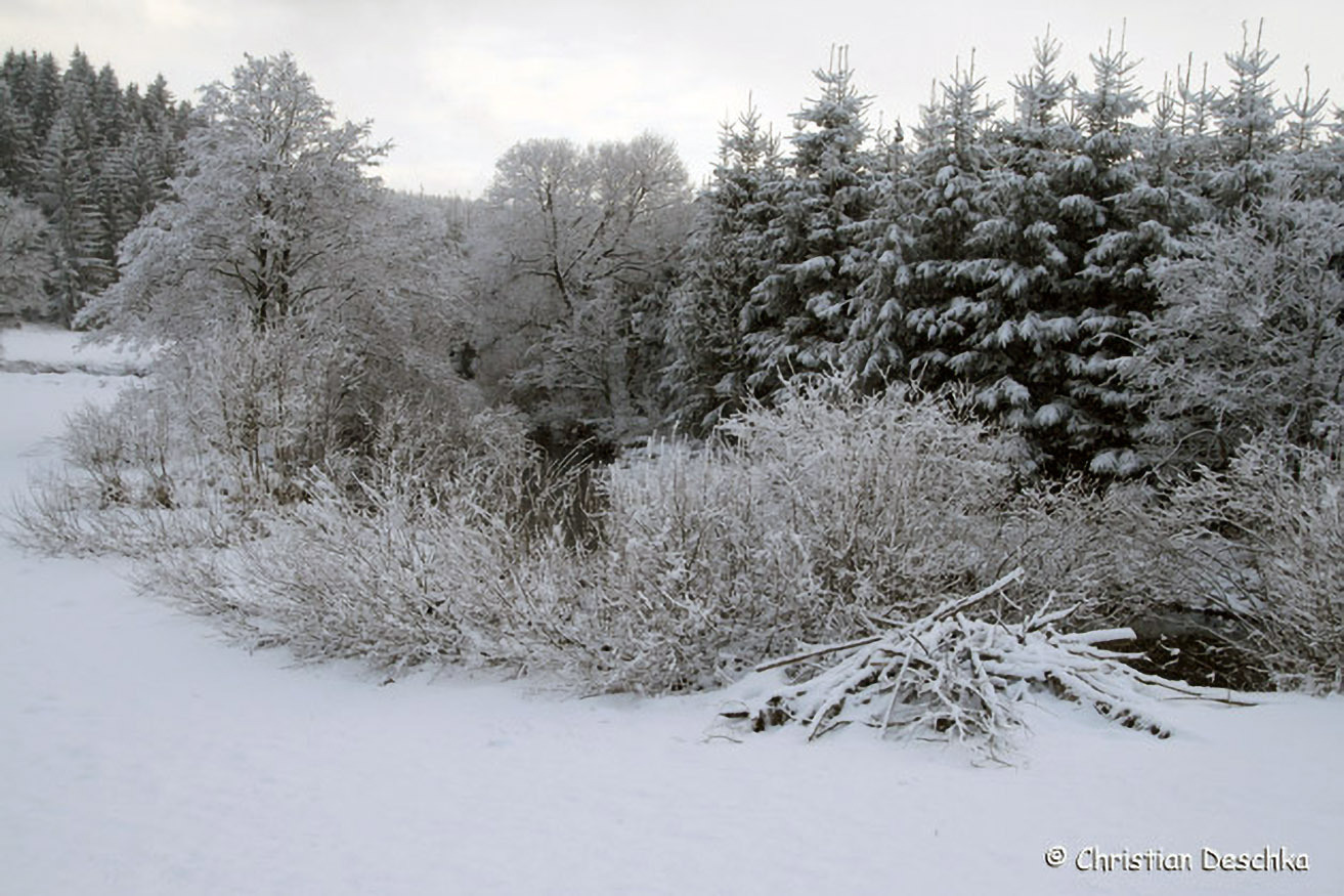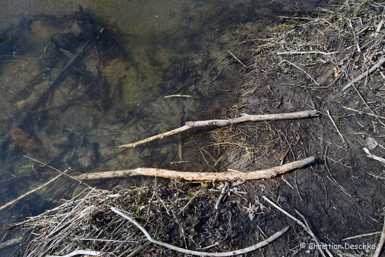 In der Vegetation sieht man von dort wegführende Wechsel, auf denen diese aus Nordamerika stammenden Nager auf Nahrungssuche gehen.