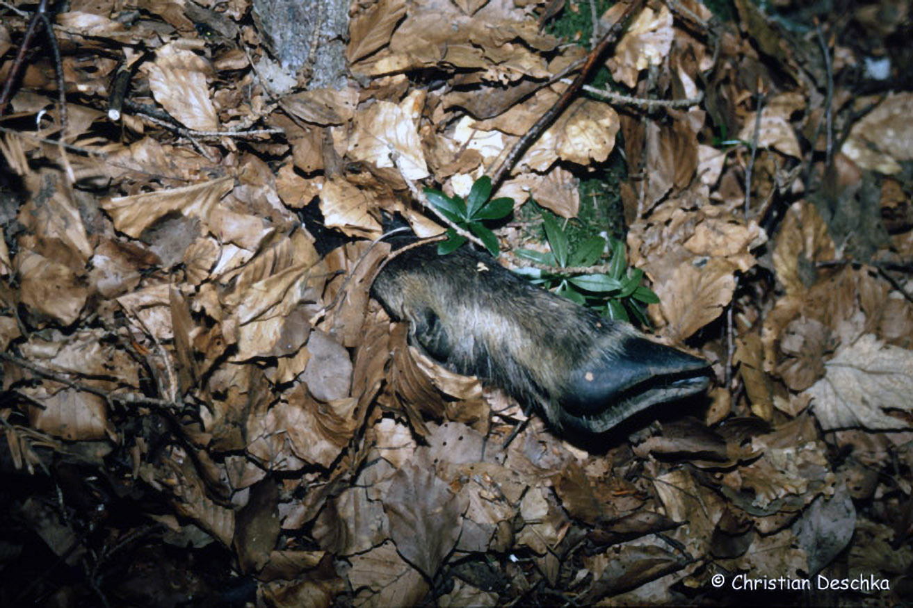 An einem Beutetier wie dieser Gämse frisst ein Luchs meist tagelang. Um Verluste durch Aasfresser in Grenzen zu halten, werden Beutetiere mit Laub etc. teilweise oder ganz verscharrt.