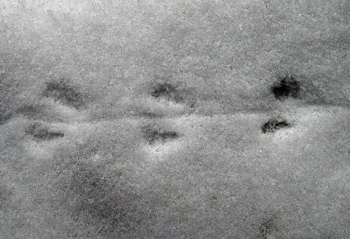 In der Spur von Waldmäusen liegen die Fußabdrück beidseits der Schleifspur des langen Schwanzes. Die Spur führt meist nur eine kurze Strecke von Mausloch zu Mausloch.