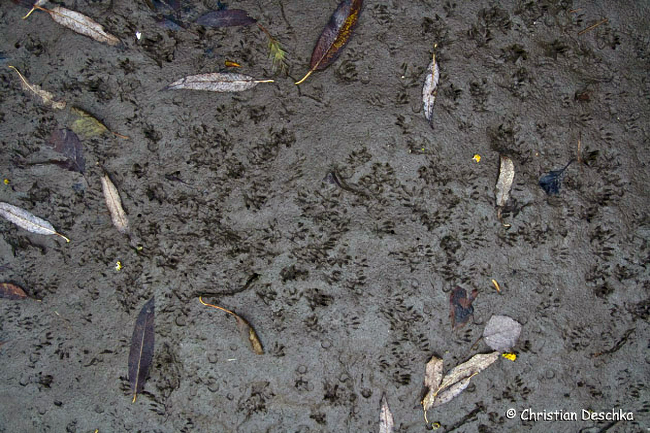 Im Uferschlamm von Bächen trifft man fast immer auf Fußabdrücke von Wanderratten. Unter Brücken bleiben sie selbst bei leichten Regenfällen erhalten und sind daher dort besonders zahlreich.