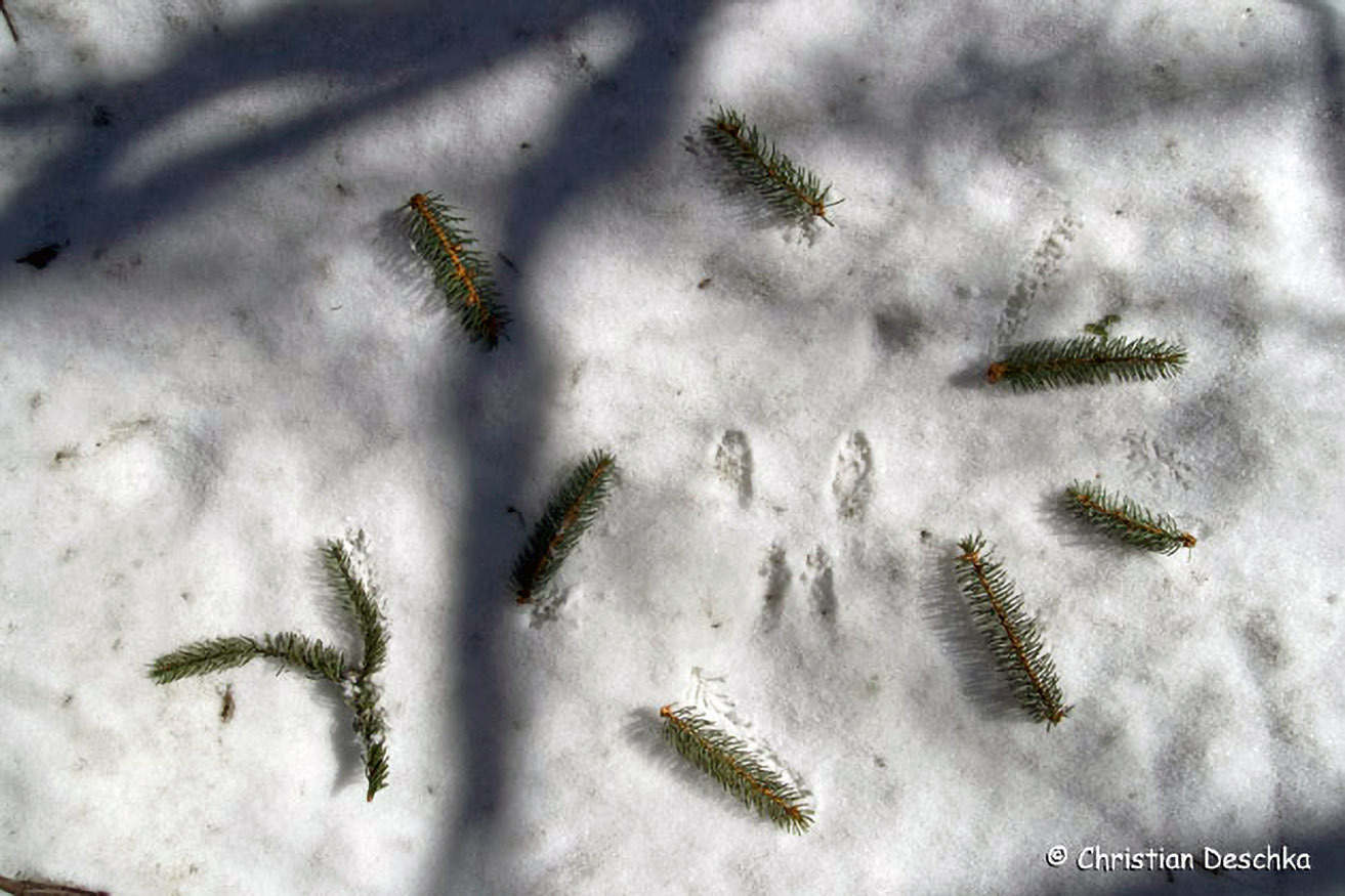 Eichhörnchen beißen im Winter gerne Fichtentriebe ab, die dann unter manchen Bäumen über den Boden verstreut zu finden sind.