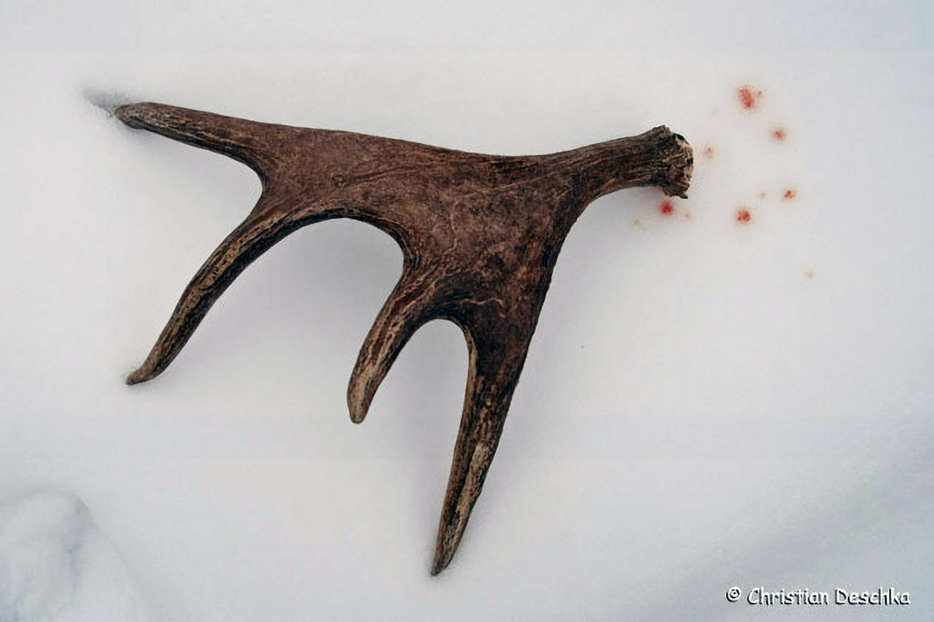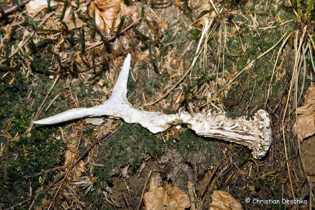 Das Geweih verlieren Rothirsche im Spätwinter. Die Abwurfstangen liegen zumeist in der Nähe von Fütterungen, wo diese großen Huftiere nicht gestört werden sollten.