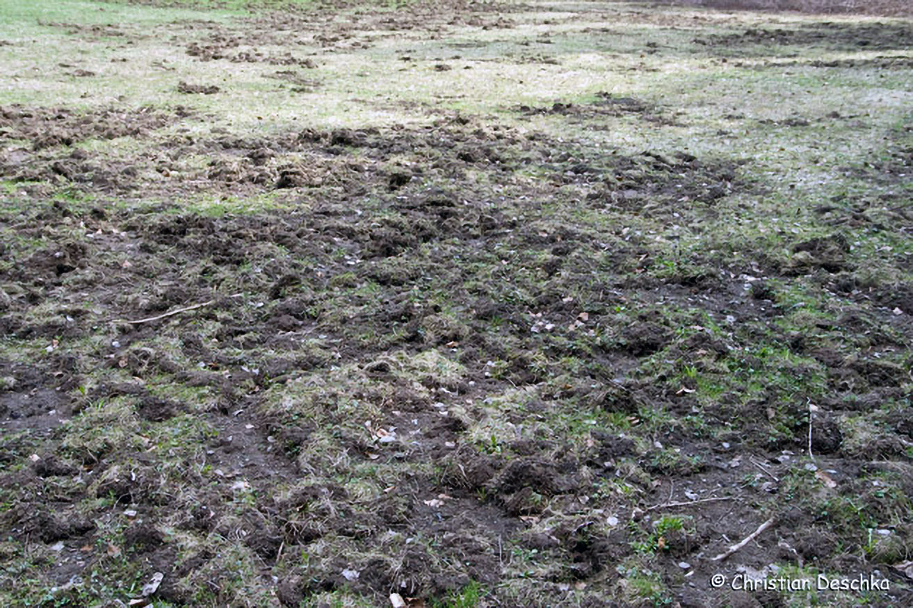 Auf der Suche nach Nahrung "durchpflügen" Wildschwein den Boden. Im Wald ist dies ein Segen, da dadurch z.B. Baumsamen besser keimen können. Auf Wiesen und Äckern hingegen kann dies ein wirtschaftlicher Schaden sein.
