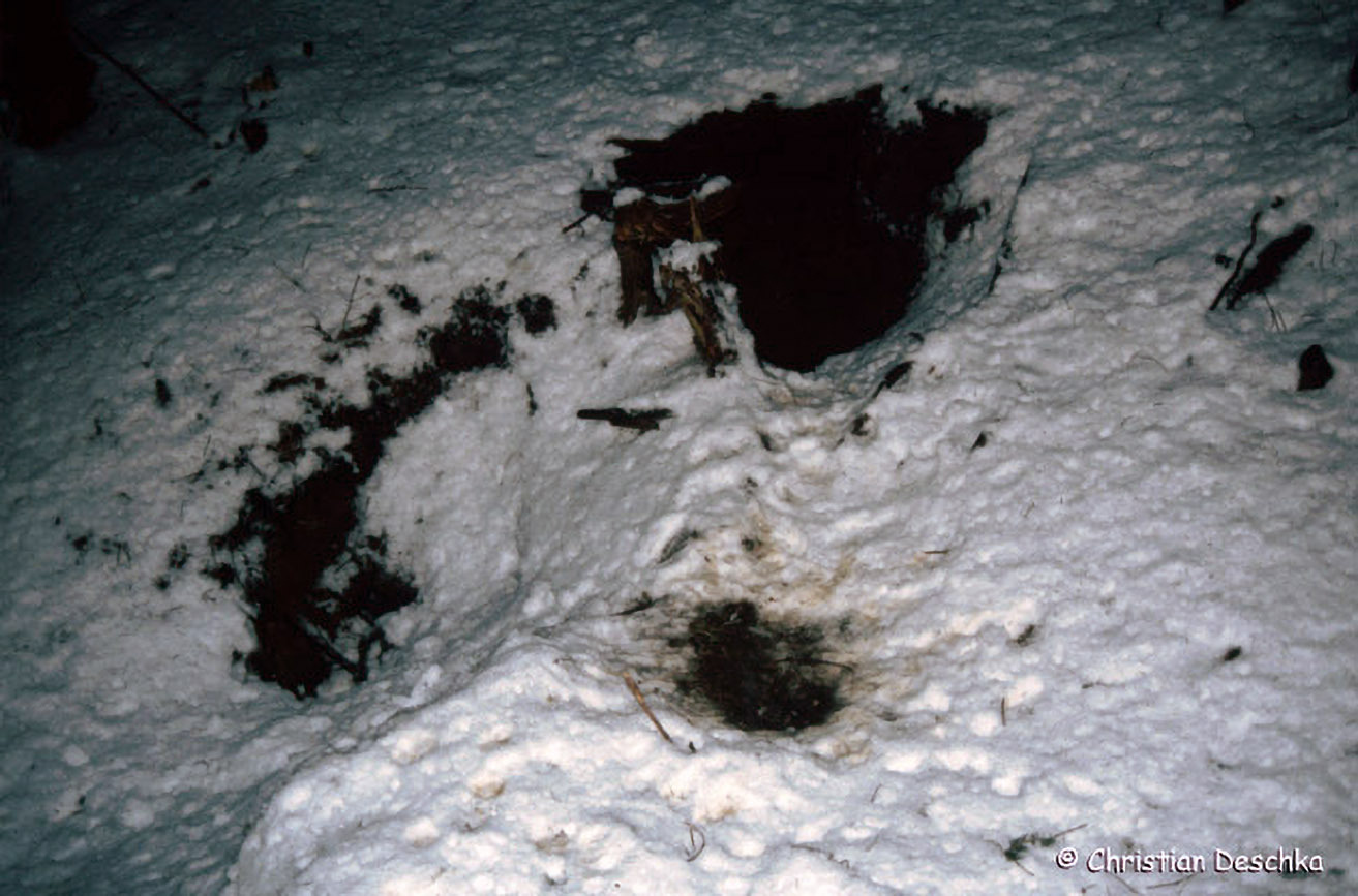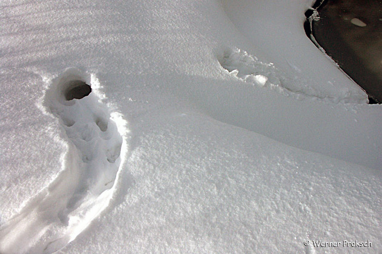 In tiefem Schnee bleibt oft eine rinnenförmige Spur zurück. Beim Einstieg ins Gewässer ist meist eine Rutsche oder - wie hier - sogar ein Schneetunnel zu finden.
