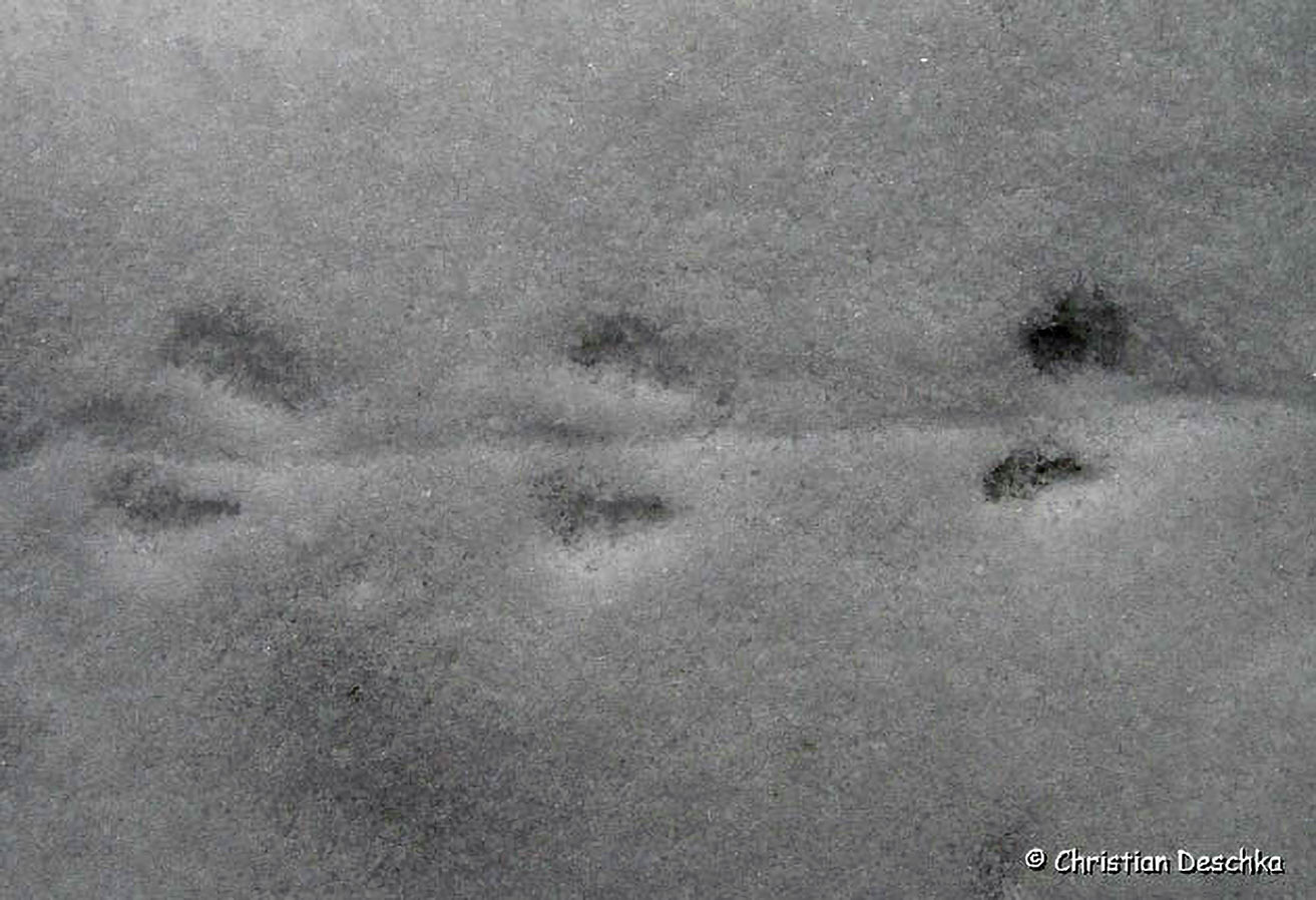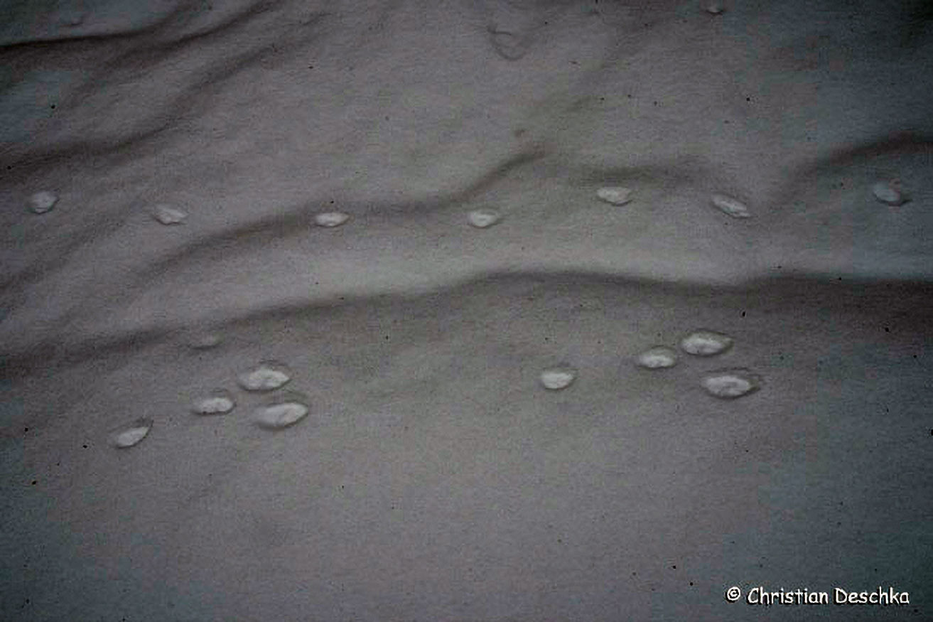 Hier sieht man eine Fuchsspur (oben) und eine Hasenspur (unten) nebeneinander. Der Hase ist nach rechts gehoppelt.