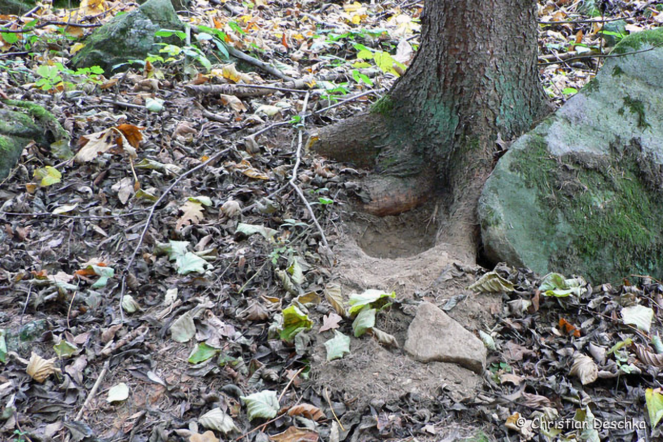 Ob ein Fuchsbau besetzt ist oder nicht, erkennt man an den Spuren. In diesem Fall haben die Füchse beim Verlassen des Baues schmutzige Abdrücke hinterlassen.