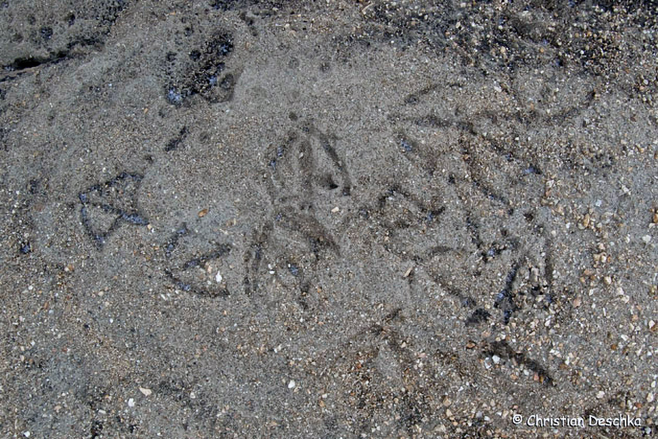 Auch Vögel können Spuren hinterlassen. Am leichtesten sind wohl jene der Stockenten zu finden. Zwischen den drei Zehen erkennt man gut die beiden Schwimmhäute
