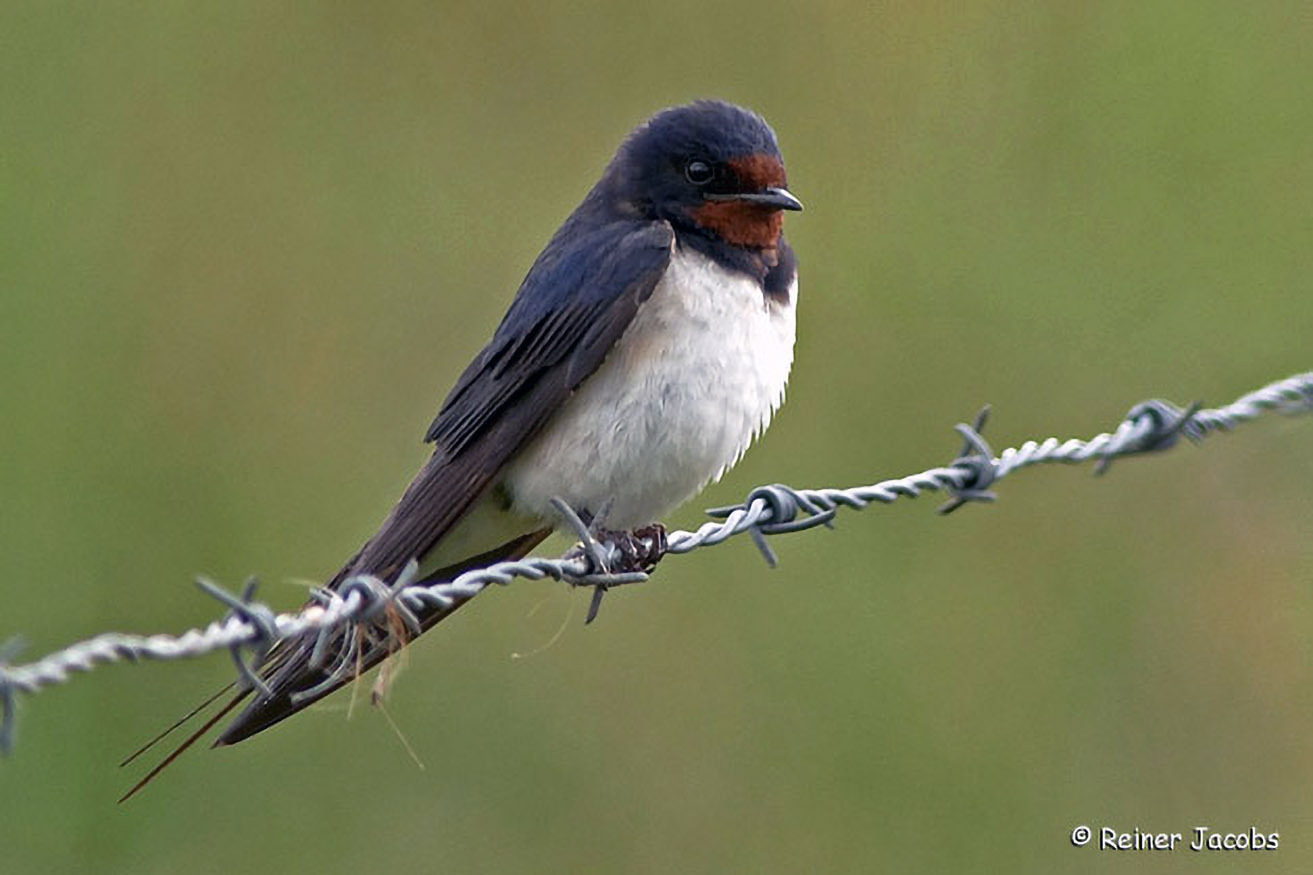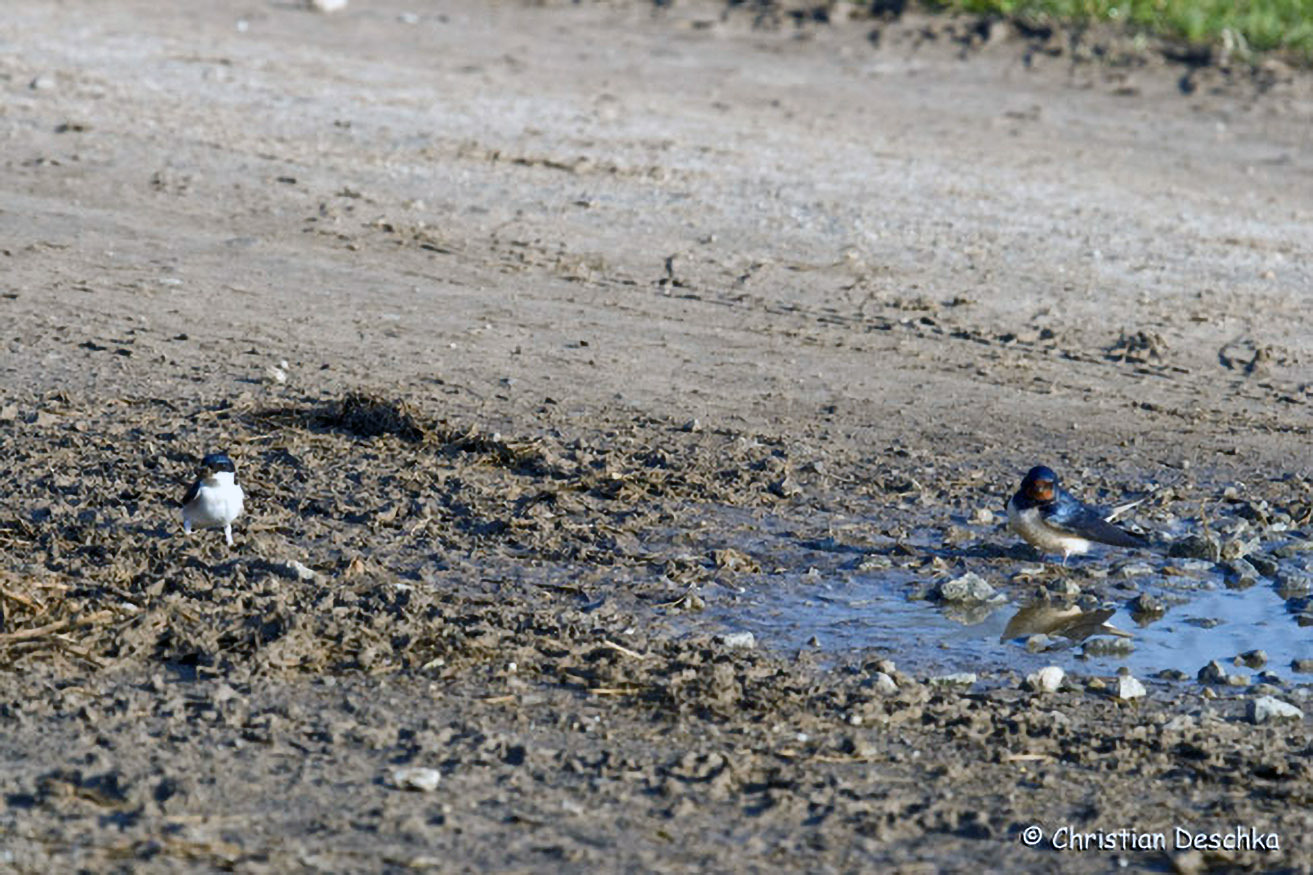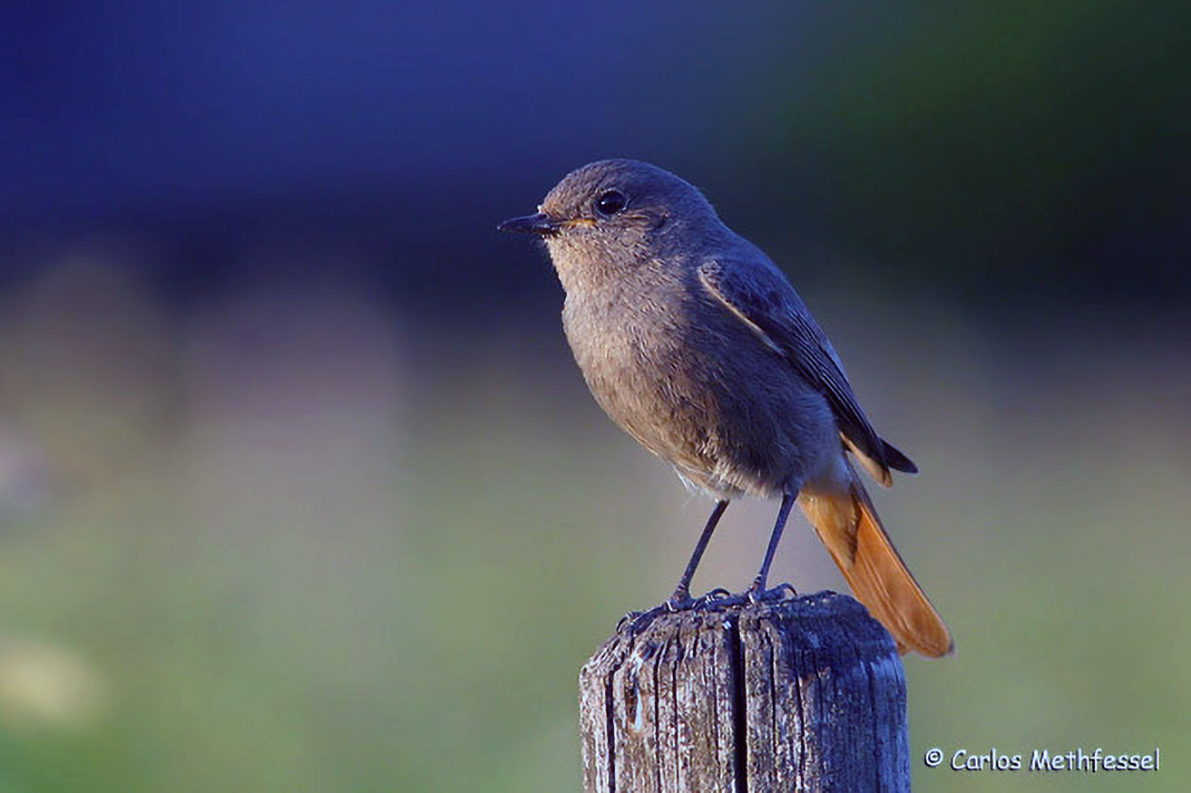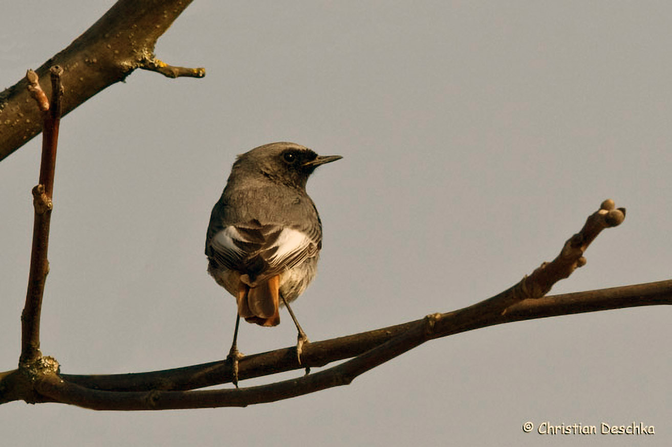 Das schlichter gefärbte Weibchen erkennt man am roten Schwanz, mit dem es oft zuckende Bewegungen ausführt.