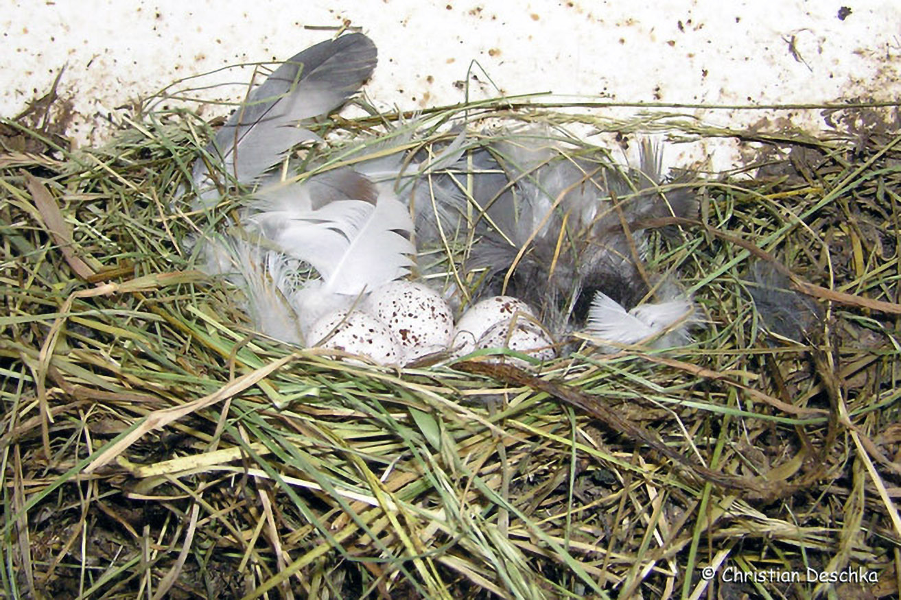 Falken tragen kein Nistmaterial ein, sondern scharren im Boden lediglich eine kleine Mulde aus. Das Bild zeigt die jungen Turmfalken im Haslacher Kirchturm.