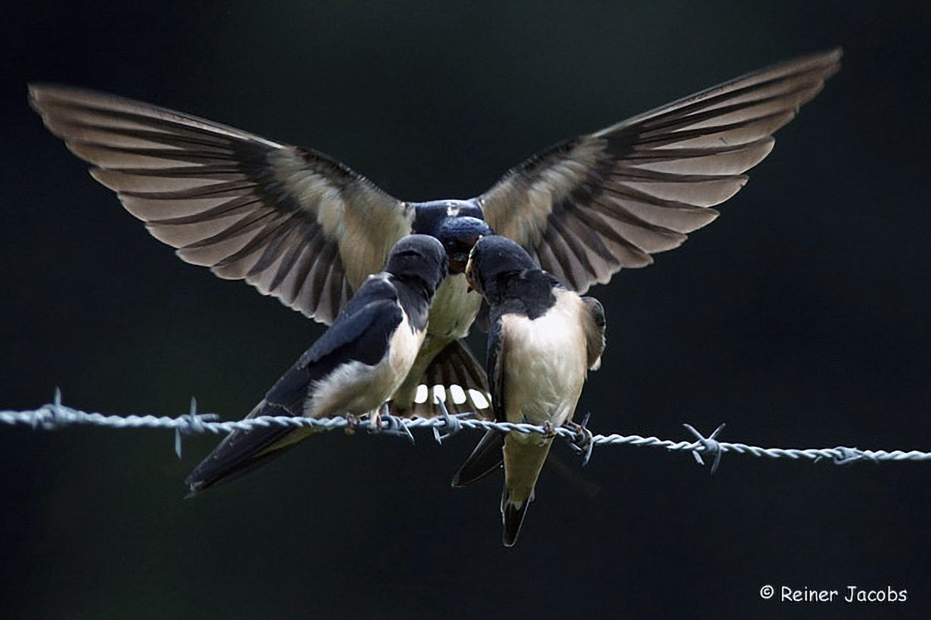 Dieses Bild zeigt einen einfärbigen alten Mauersegler (links) und drei bereits gut entwickelte Jungvögel mit hellen Federrändern.