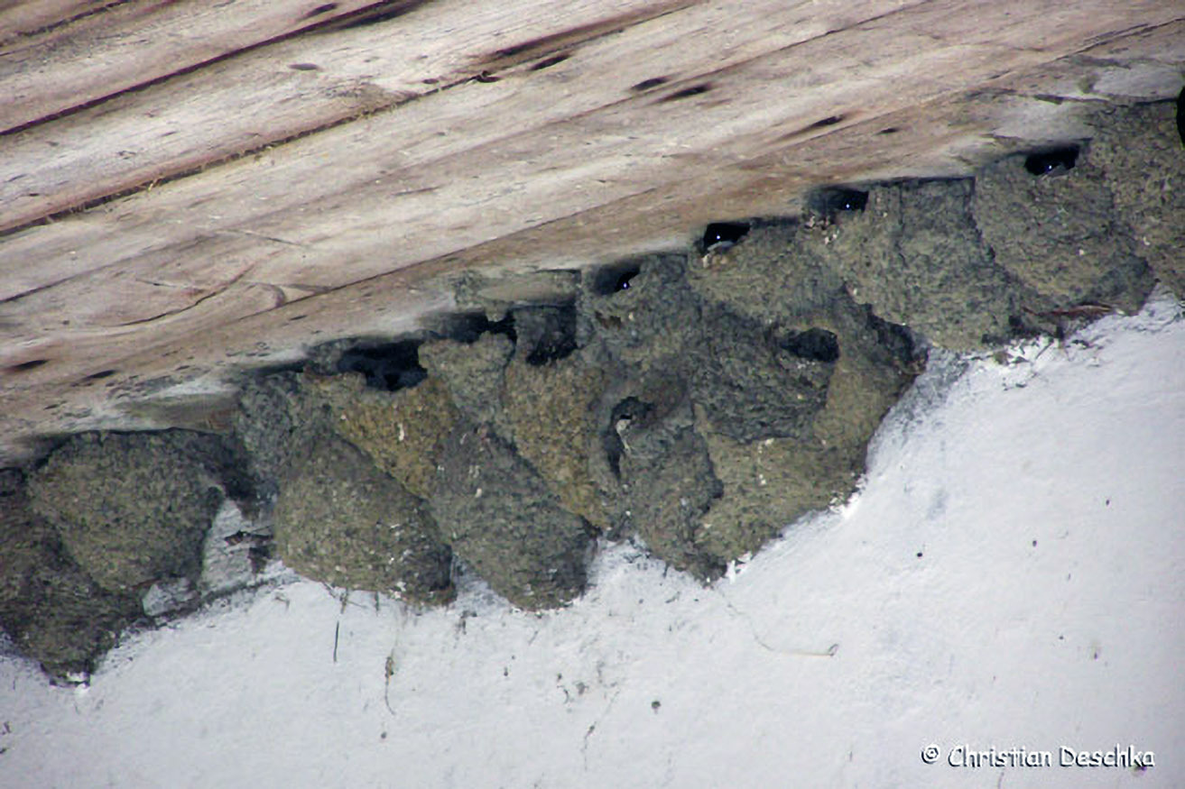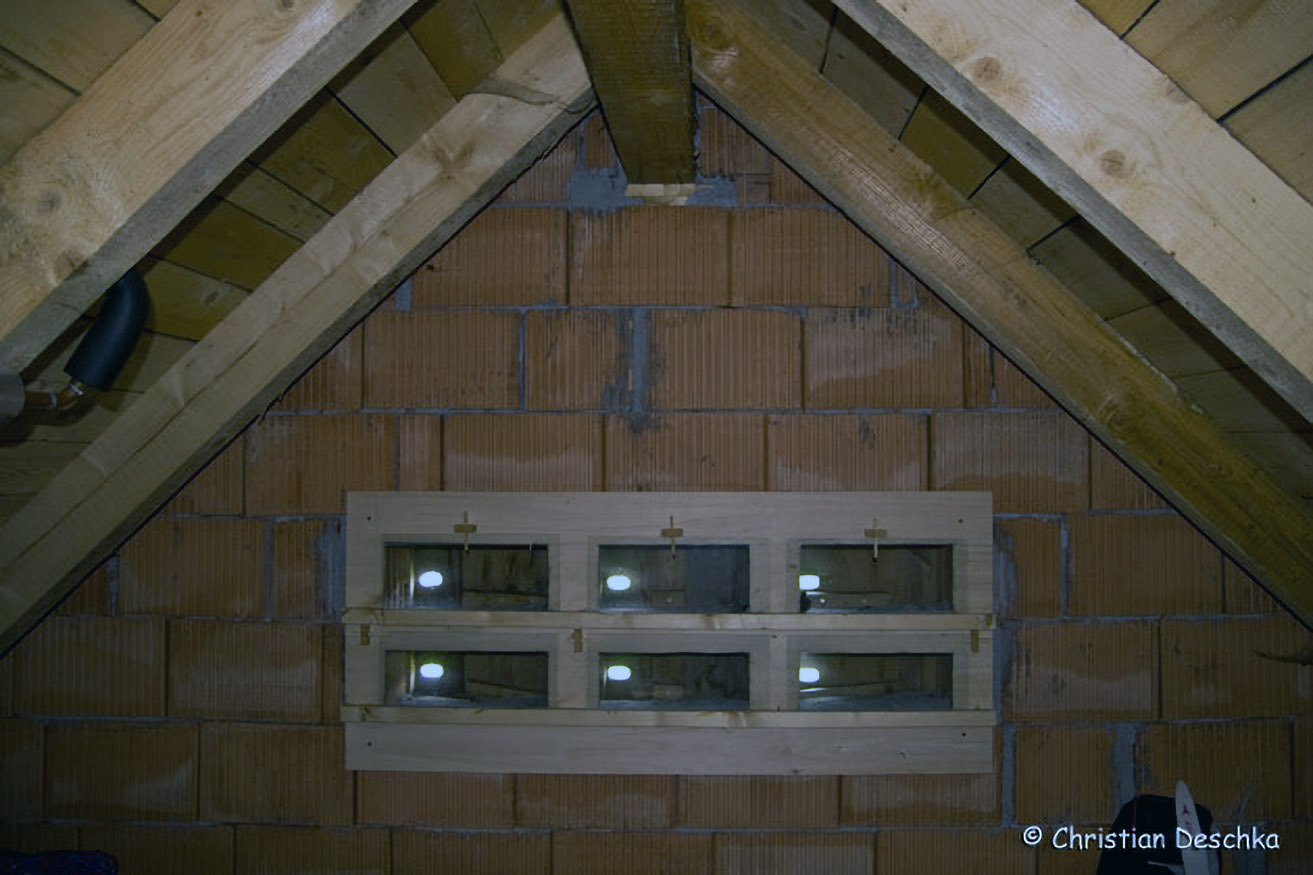 Man kann Nistkästen auch so in eine Hausmauer integrieren, dass sie auf der Rückseite eine Glaswand haben und so eine Beobachtung des Brutgeschehens erlauben. Hier sehen wir eine kleine Kolonie mit 6 Brutplätzen.