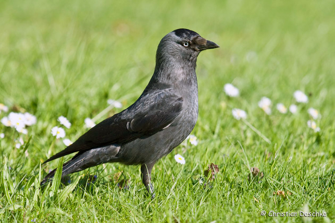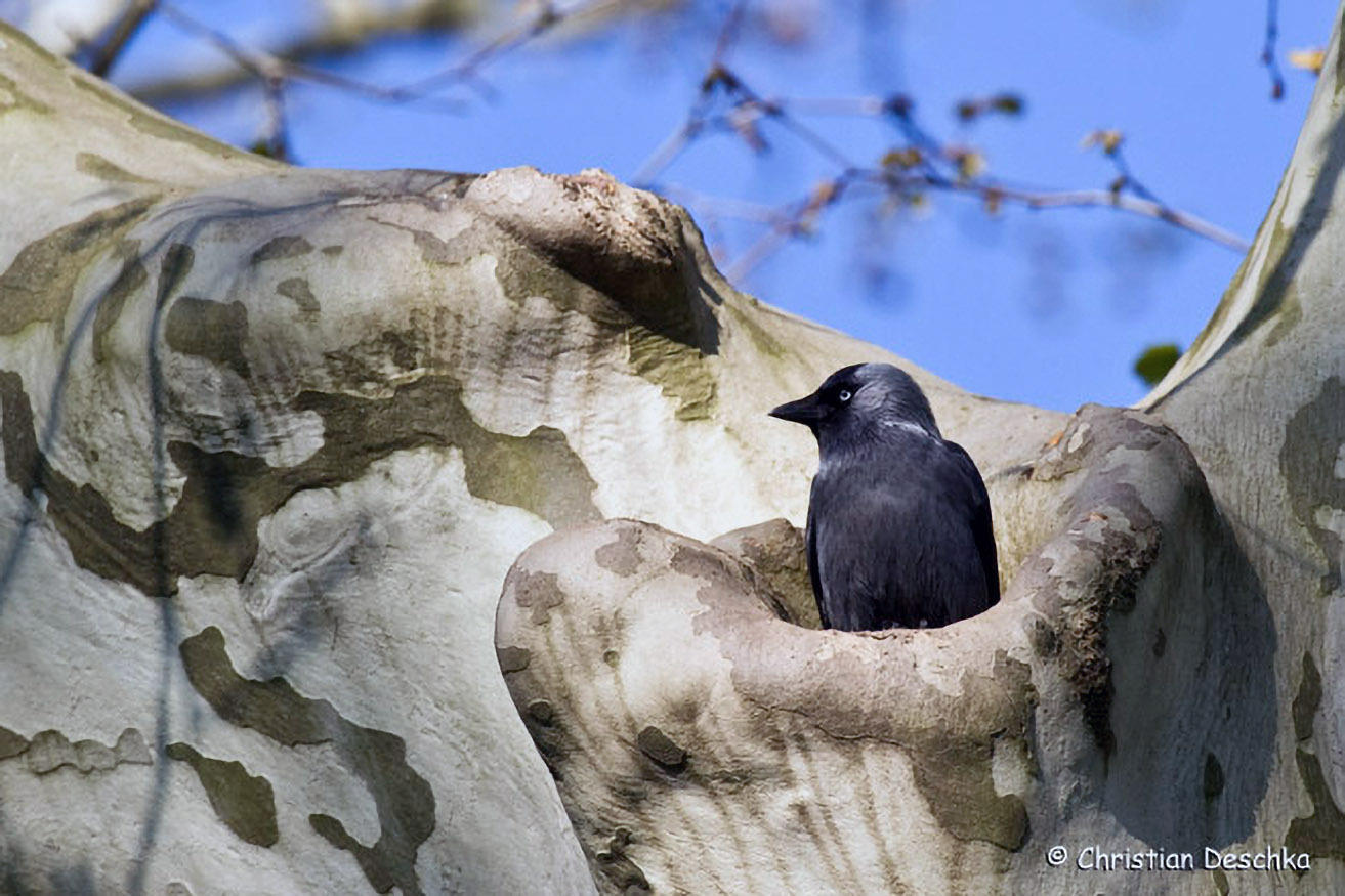 Die Dohle ist regelmäßig an Gebäuden und in Parks zu beobachten. Sie ist nicht nur etwas kleiner als Krähen, sondern hat auch eine helle Iris und einen grauen Nacken.