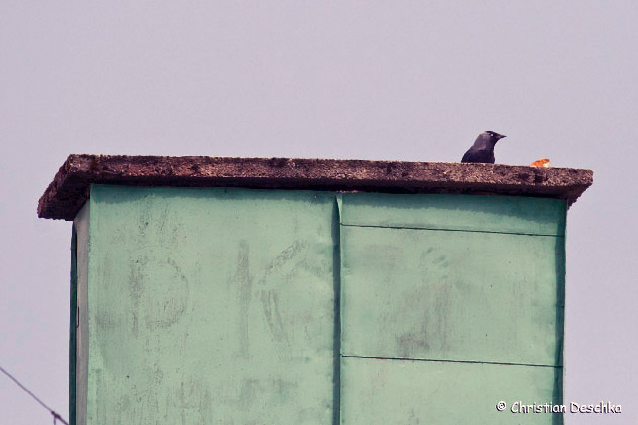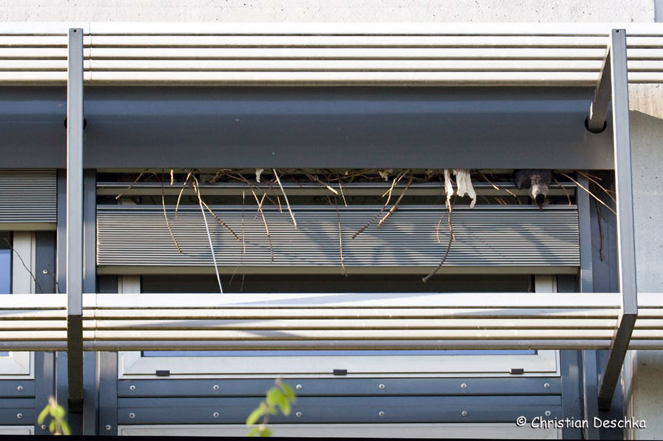 Diese freche Dohle hat ihr Nest im Jalousienkasten eines modernen Gebäudes errichtet. Bei genauem Hinsehen erkennt man rechts oben die Dohle beim Ausfliegen.