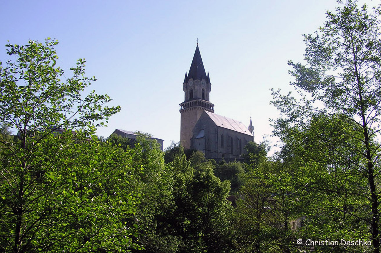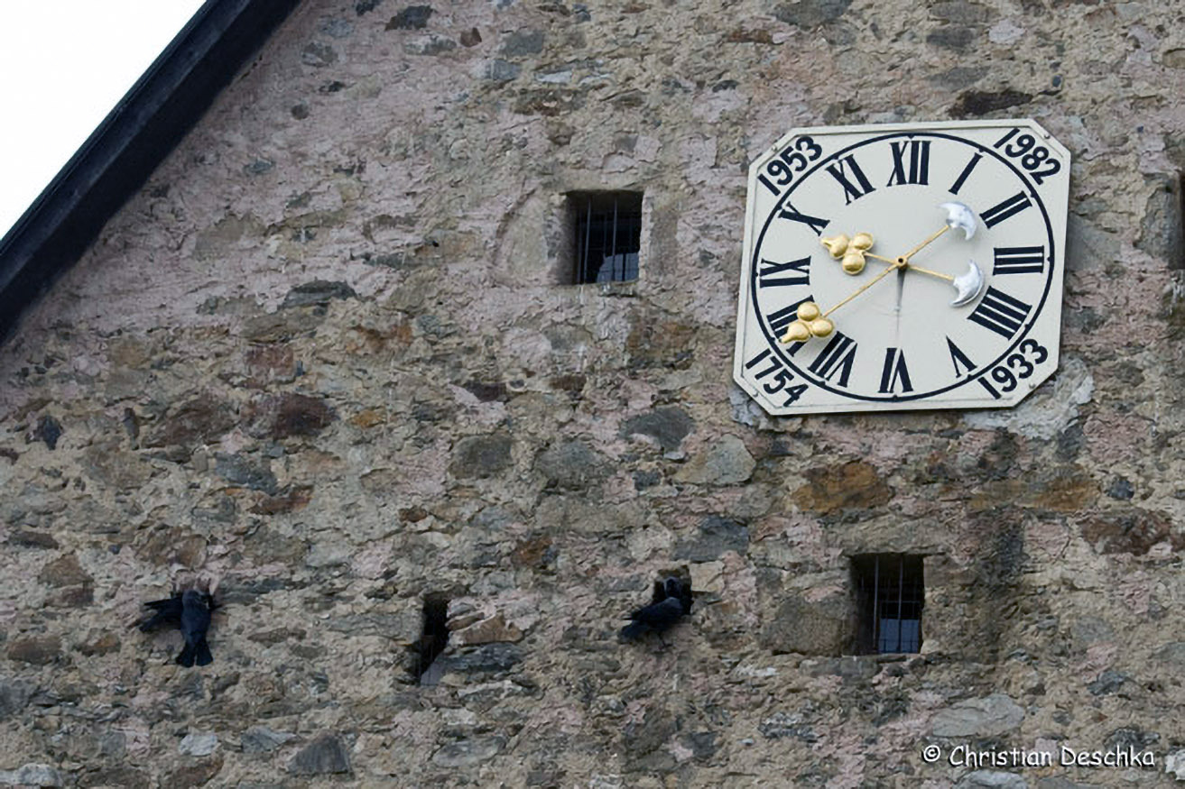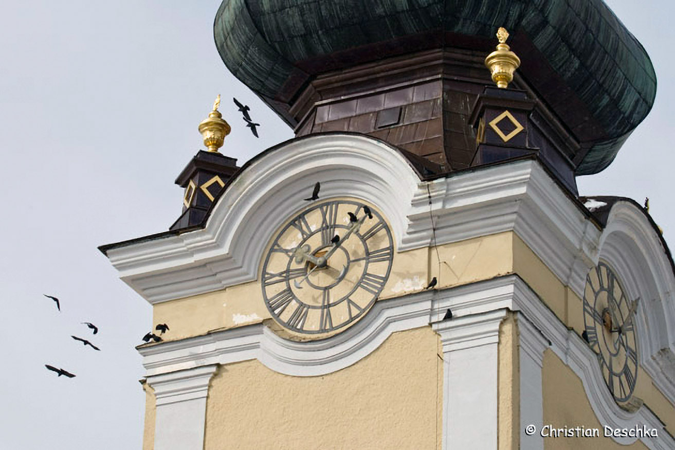 Hier sieht man Dohlen beim Eintragen von Nistmaterial in den alten Turm von Haslach. Würde man an Kirchen und Türmen hinter manchen Öffnungen Nistkästen anbringen, wäre das Problem für beide Seiten gelöst.