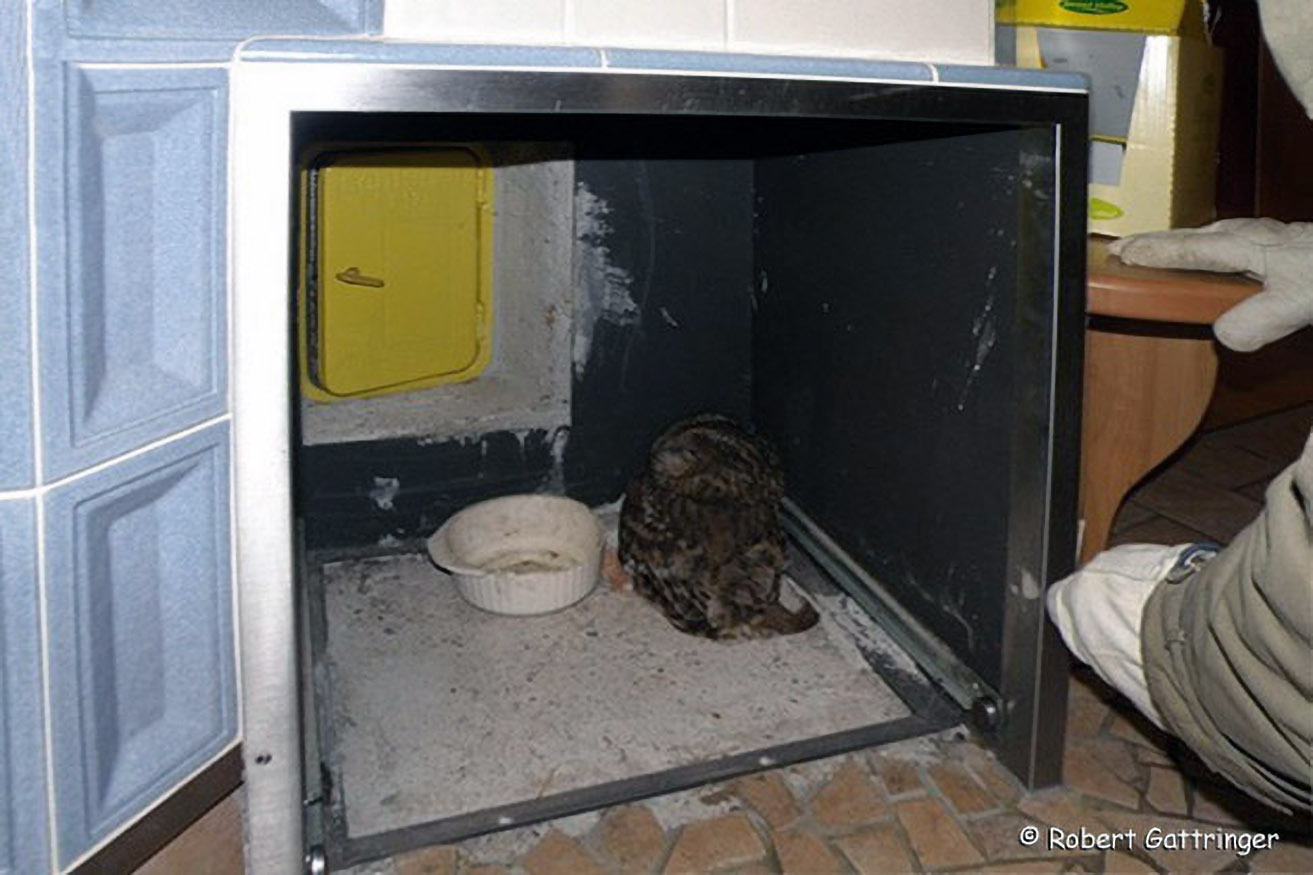Und es ist auch schon manchmal vorgekommen, dass beim Aufmachen des Ofentürls ein Waldkauz dahintersitzt. Dieser hier wurde befreit, versorgt und in die Freiheit entlassen.