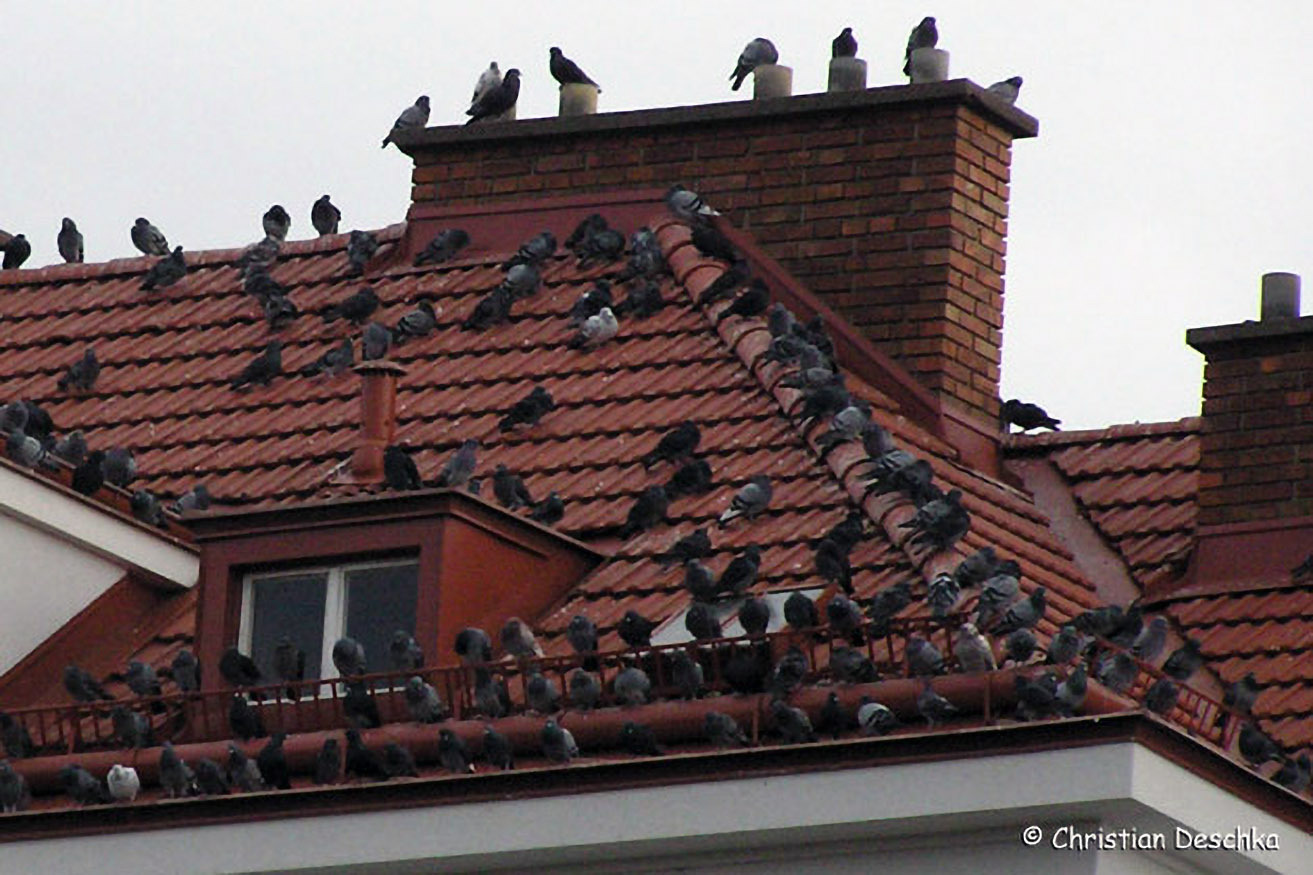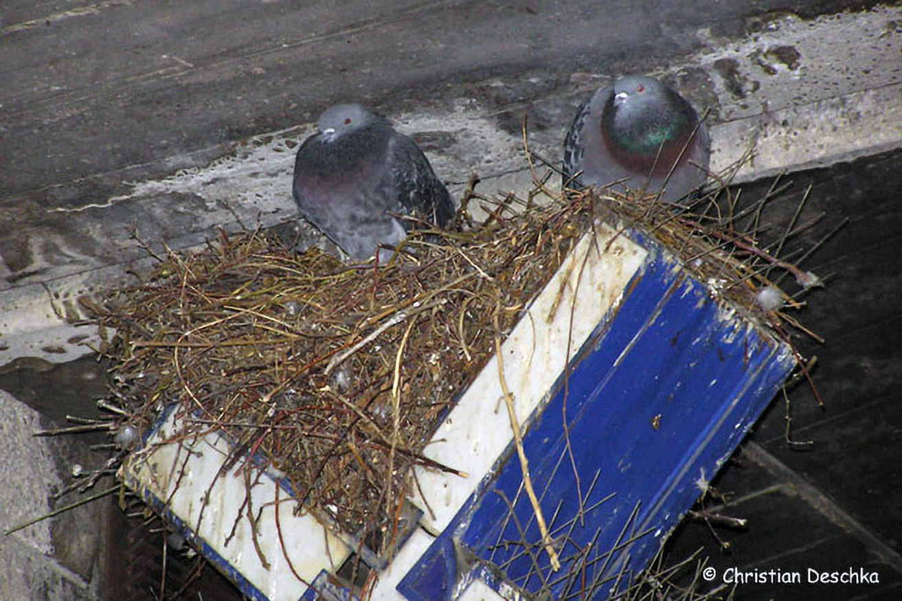 Sie schafft es sogar auf Leuchtreklamen zu brüten, die mit langen "Stacheln" zur Taubenabwehr versehen sind.