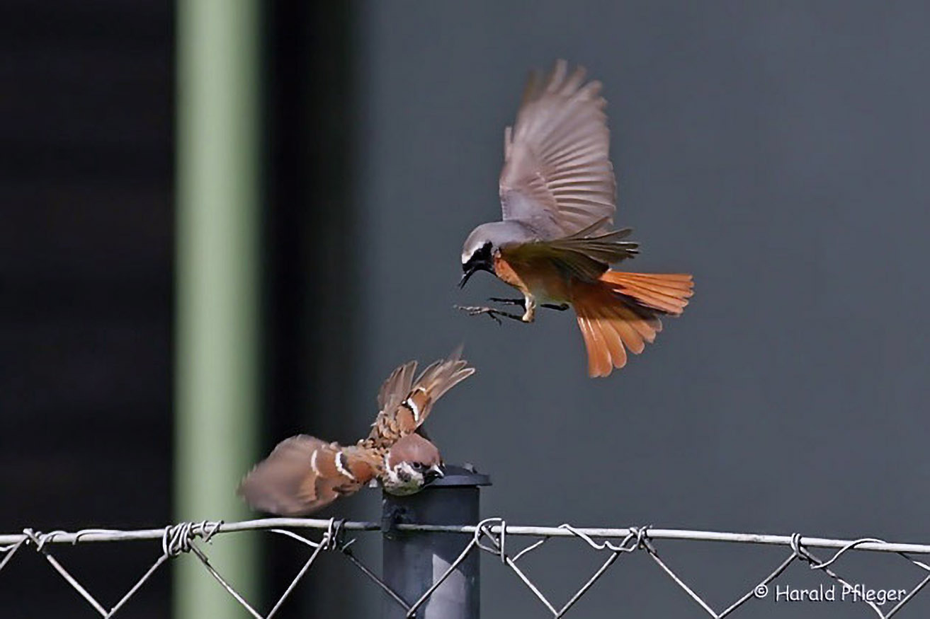 Der Gartenrotschwanz ist wesentlich seltener als der Hausrotschwanz und kommt ebenfalls im Siedlungsraum vor. Hier ein Männchen beim Vertreiben eines Feldsperlings.